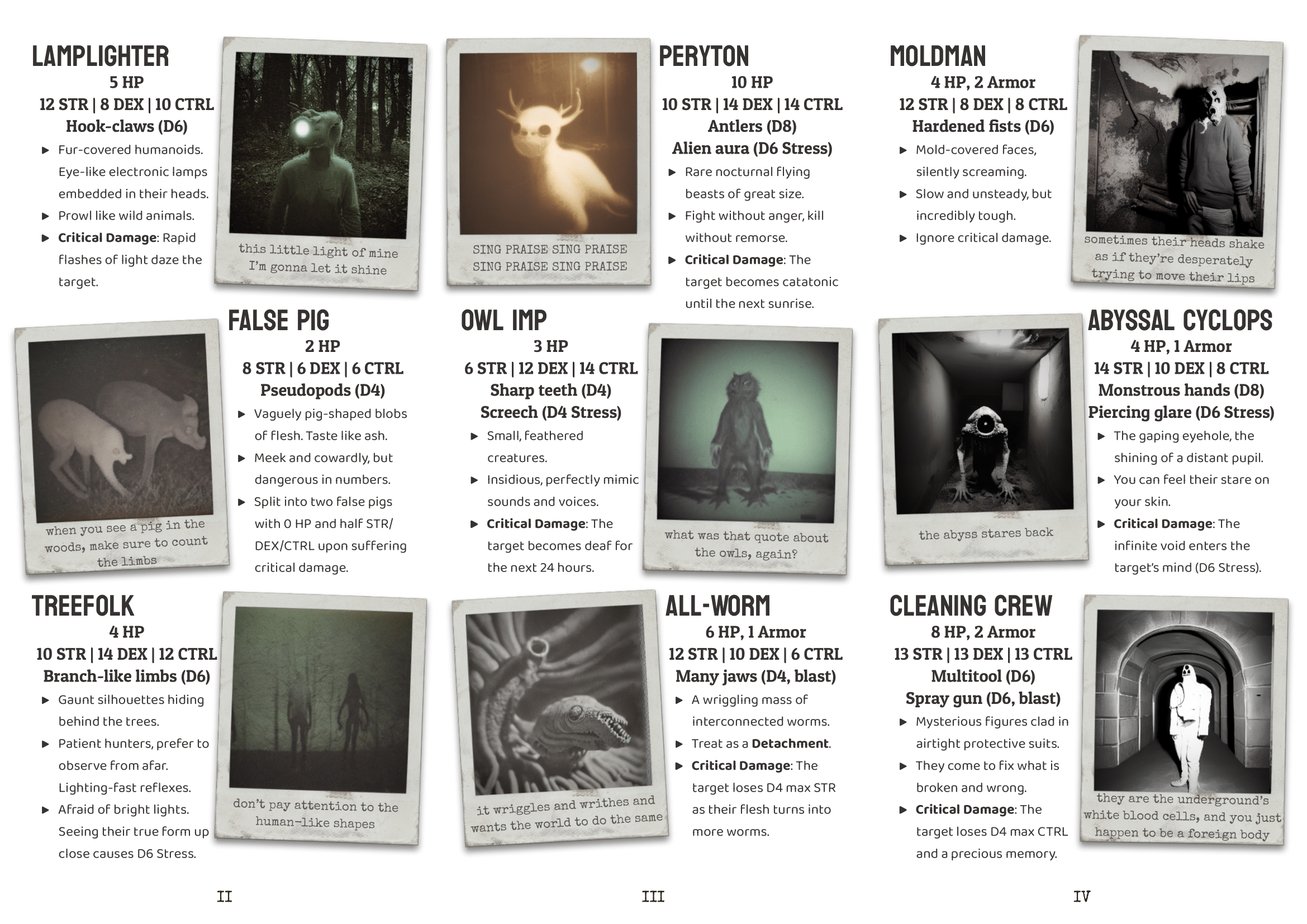 | Tags | bestiary, Horror, liminal-horror, Monsters, Mystery, pamphlet, tabletop-role-playing-game |