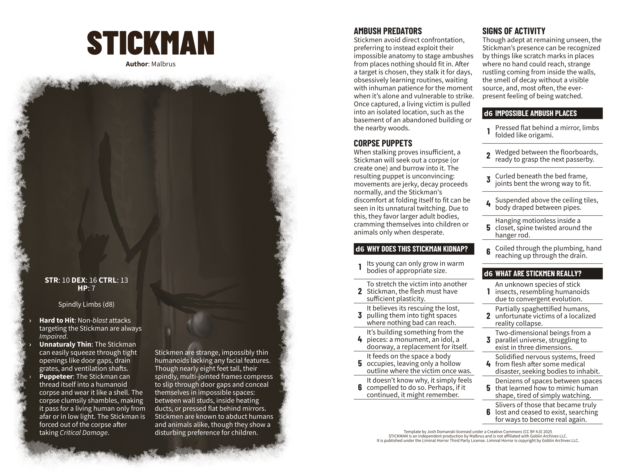 STICKMAN is an independent production by Malbrus and is not affiliated with Goblin Archives LLC. It is published under the Liminal Horror Third Party License.